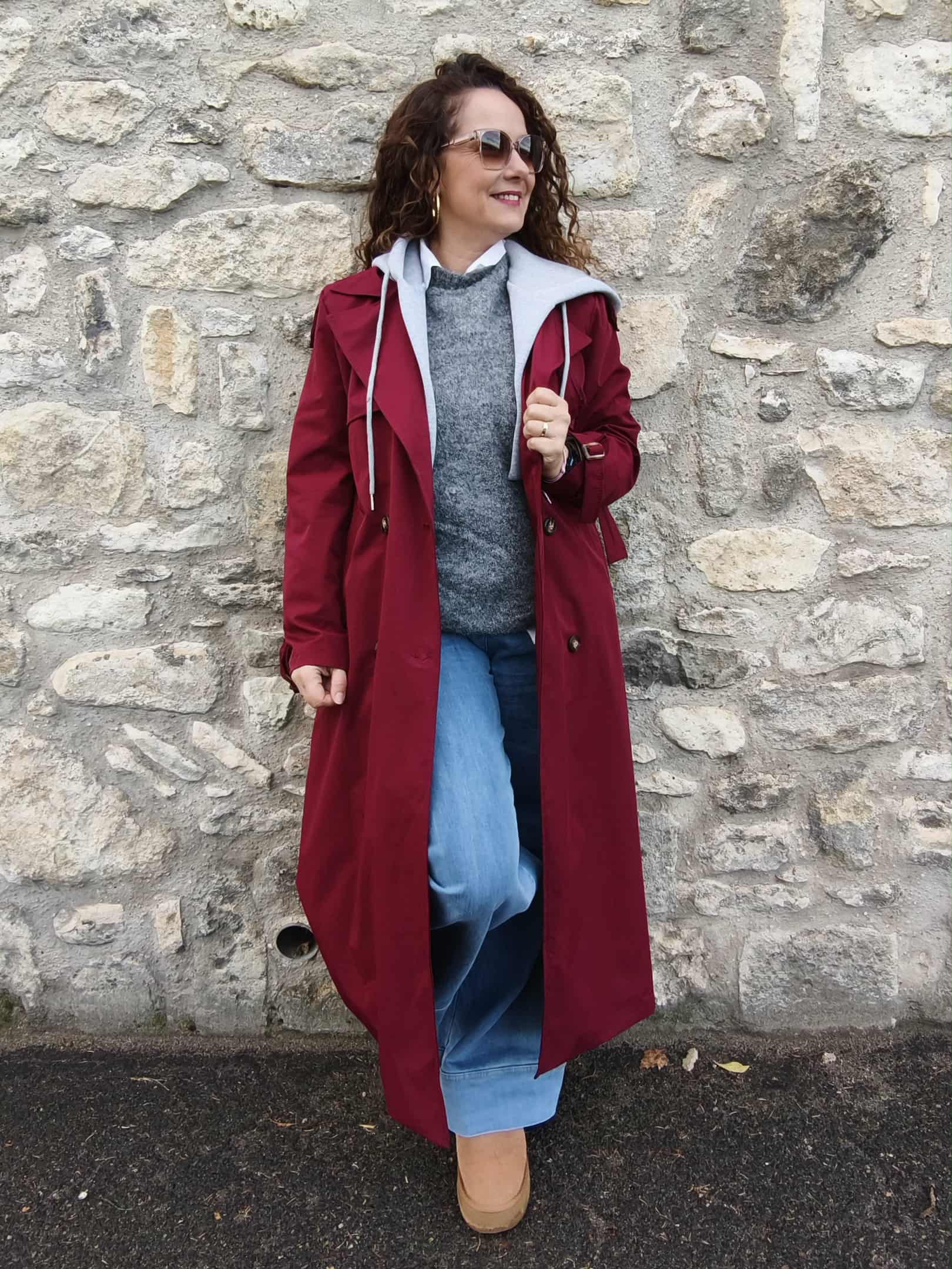 Trench bordeaux à capuche grise